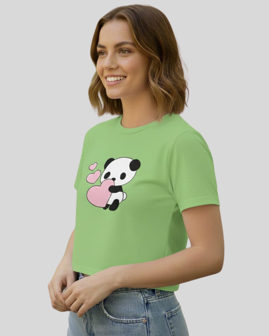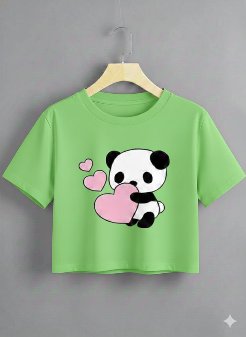 Fabric: Cotton Sleeve Length: Short Sleeves Net Quantity one. Upgrade your casual style with this adorable green crop top featuring a cute panda holding a heart print. The stylish cropped length and regular fit make it perfect to pair with jeans, shorts, or skirts. Country of Origin: India